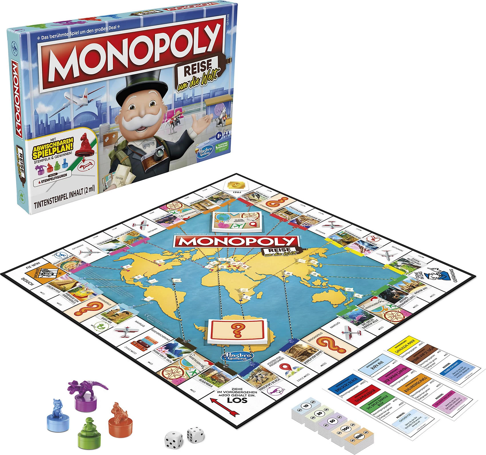 Mit dieser tollen Brettspielversion des Spiele-Klassikers Monopoly geht es auf zu den Sehenswürdigkeiten der Welt! Mit „Monopoly Reise um die Welt“ von Hasbro brechen die Spielenden auf, um Sehenswürdigkeiten zu kaufen, neue Ziele zu entdecken und schließlich die Erinnerungen festzuhalten. Auf dem abwischbaren Spielplan können die Weltreise-Fans die besuchten Orte mit dem eigenen Stempel markieren und das Gegenstück zu den Grundstücken sind hier die Sehenswürdigkeiten. Zieht ein Spieler eine Reisetagebuchkarte, so stempelt er diese dauerhaft ab und sie wird zu einem spannenden Teil des Spiels und kann das Glück eines Spielers bei zukünftigen Partien beeinflussen. Für alle, die gerne um die Welt reisen möchten ist die Monopoly-Edition perfekt geeignet. Die Besitzkarten für die Sehenswürdigkeiten begeistern mit vielen Infos.