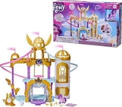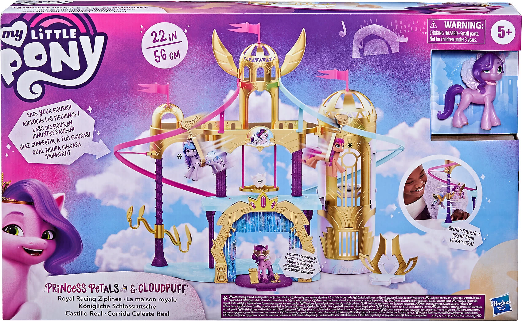 Hier kommt Princess Petals – ein Pegasuspony vom Pegasushügel! Princess Petals ist eine stylische und talentierte Popstar-Prinzessin. Mit der Königlichen Schlossrutsche kann sie zu ihrem nächsten Auftritt sausen. Dieses Schloss-Spielset ist vom Palast auf dem Pegasushügel im Film My Little Pony: A New Generation inspiriert und königliche 56 cm groß. Einfach die beiliegenden Princess Petals und Cloudpuff Figuren an den Seilrutschen befestigen, und schon geht‘s los. Sie sausen vom höchsten Turm um das Schloss und direkt auf die Bühne! Enthält 9 Mode- und Story-Accessoires und zeigt lustige Spielbereiche innerhalb des Schlosses. Enthält eine pinkfarbene 7,5 cm große Princess Petals Ponyfigur mit geformtem lilafarbenem Haar mit einem besonders schillernden Look. Das Spielset zum Film ist ein großartiges Weihnachts- oder Geburtstagsgeschenk für Kinder ab 5 Jahren. My Little Pony and all related characters are trademarks of Hasbro.