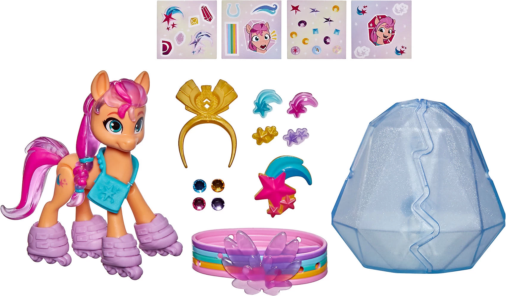 Hier startet ein magisches Kristall-Abenteuer! Mit Überraschungsaccessoires zum jeweiligen Charakter kann die Magie der Überraschungen enthüllt werden. Die Kristall-Abenteuer Ponys kommen im Look zum Film My Little Pony: A New Generation und bringen 20 Teile mit, inklusive Accessoires, Sticker, Charms und mehr. Dabei kommt jede Figur mit einem Freundschaftsarmband, das die Kinder dekorieren und selbst tragen können. Es gibt Kristall-Abenteuer Sunny Starscout, Princess Petals, Zipp Storm und Izzy Moonbow (jeweils separat erhältlich. Je nach Verfügbarkeit). Das Spielzeug eignet sich für Kinder ab 5 Jahren. My Little Pony and all related characters are trademarks of Hasbro.