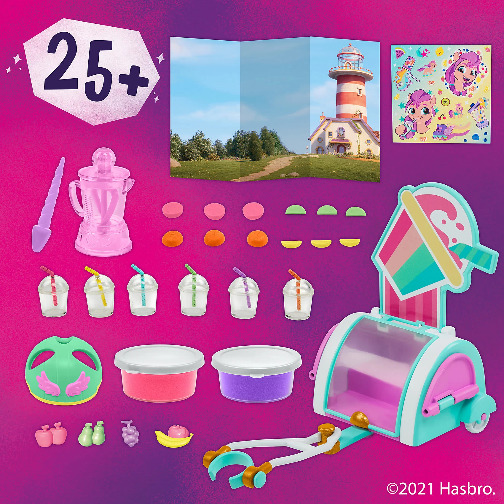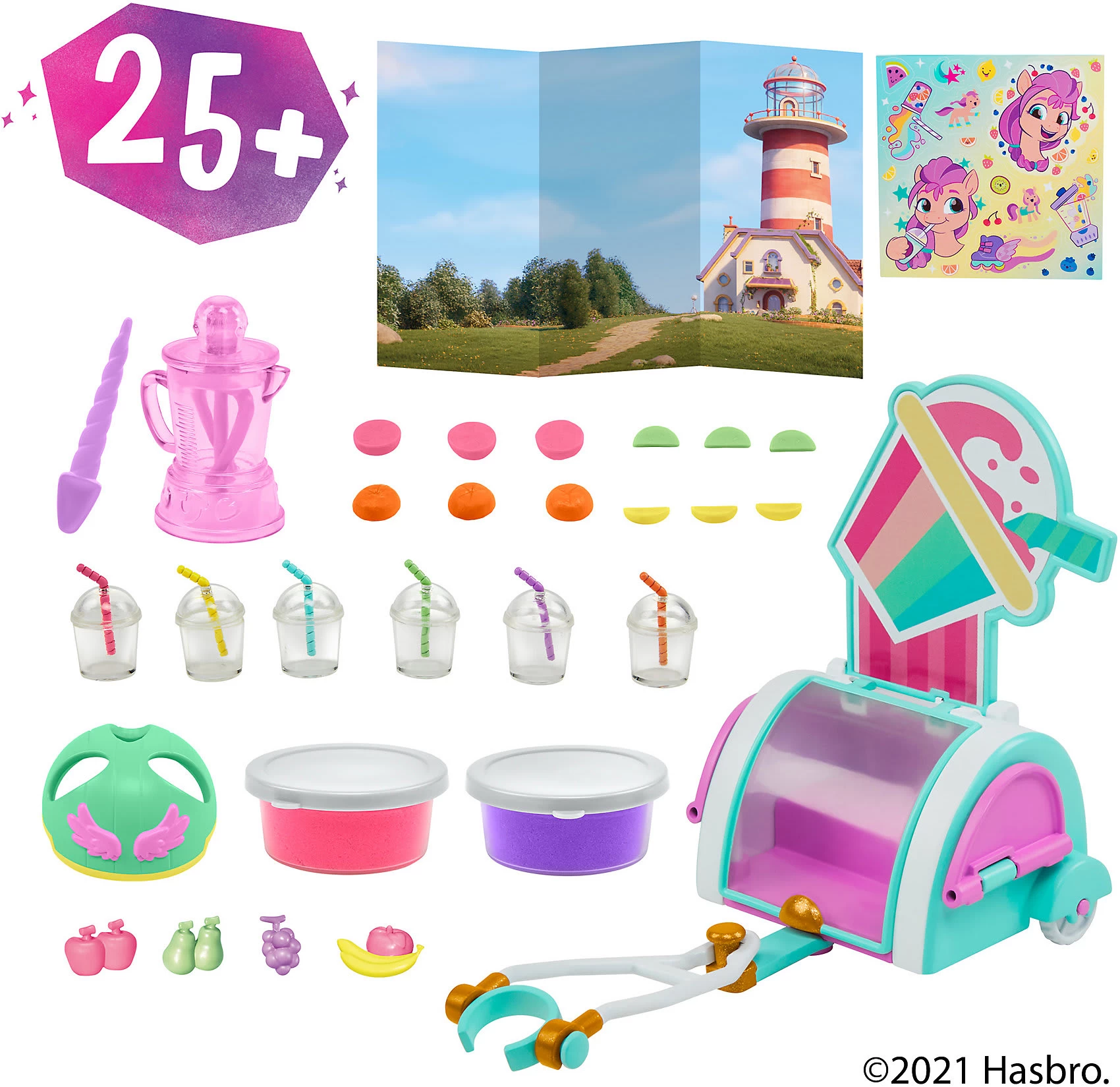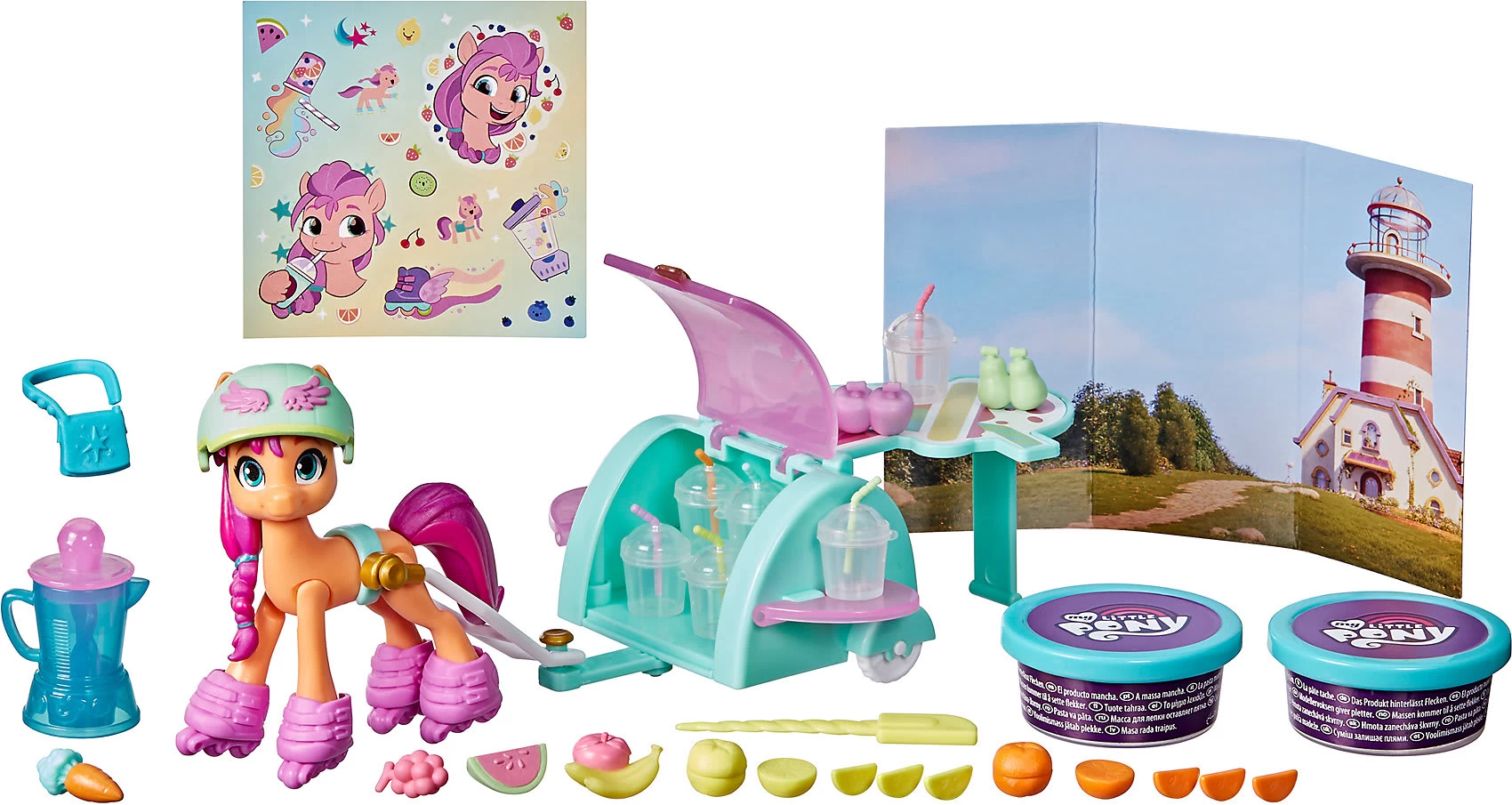 Mit der enthaltenen Storyszene kann Smoothie Shop Sunny Starscout auf jede Menge spannende Abenteuer geschickt werden. Das Set enthält eine 7,5 cm große, orangefarbene Sunny Starscout Ponyfigur mit geformten pinken Haaren. Weiterhin befinden sich im Set über 25 Teile, inklusive toller Accessoires, mit denen die Kinder das Pony anpassen können. Aus der Spielmasse in den 2 enthaltenen Dosen können sogar Spiel-Smoothies gemixt werden Wird die Masse in das Mixer-Accessoire gefüllt, lässt sie sich darin richtig drehen und es entsteht eine bunte Leckerei. Wird die Masse dann in die Becher gefüllt und mit den lustigen Früchten garniert, entsteht ein leckerer Spiel-Smoothie. Dank der enthaltenen Storyszene können Kinder so tun, als ob Sunny wie im Film mit ihrem Wagen Smoothies verkauft.