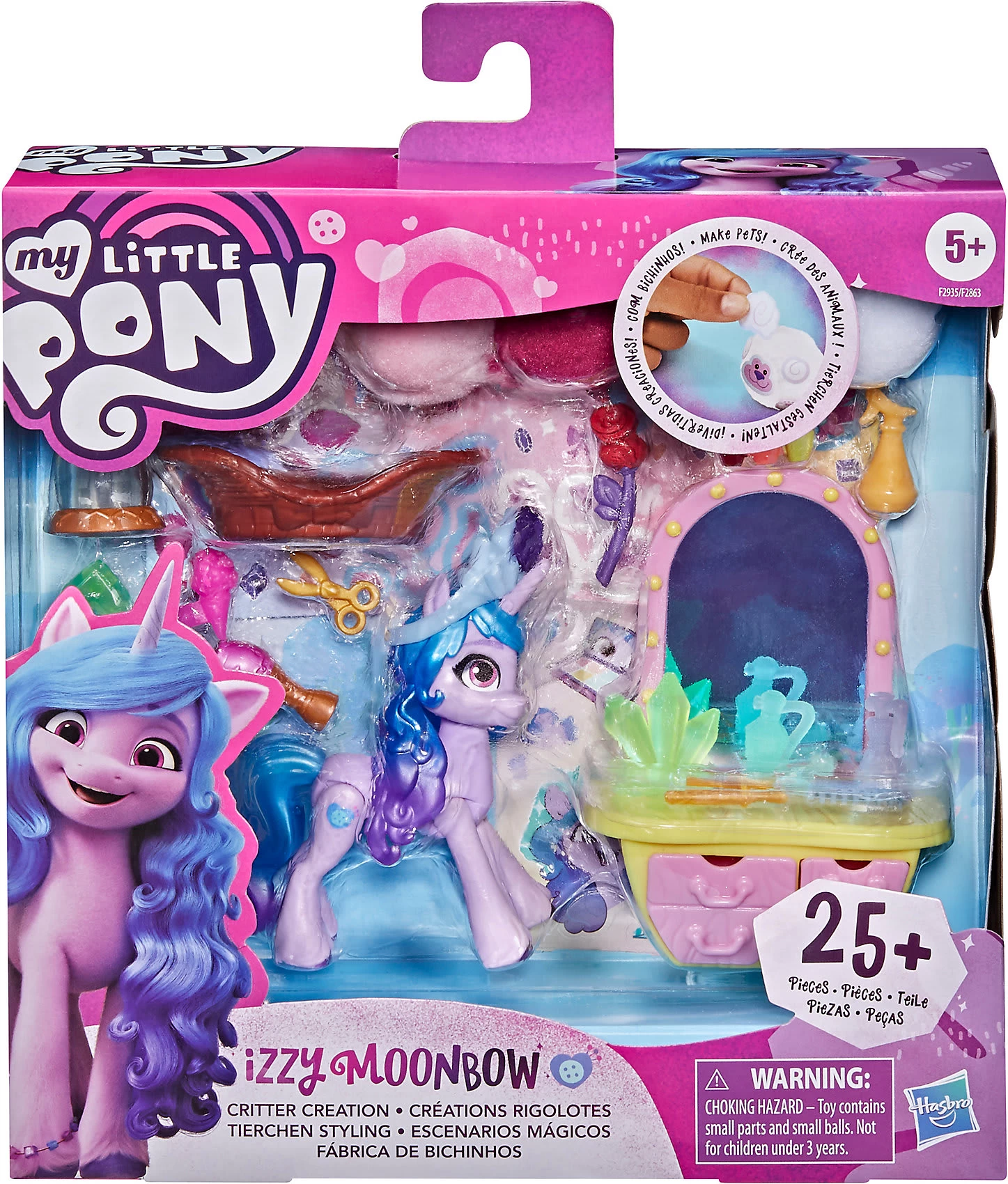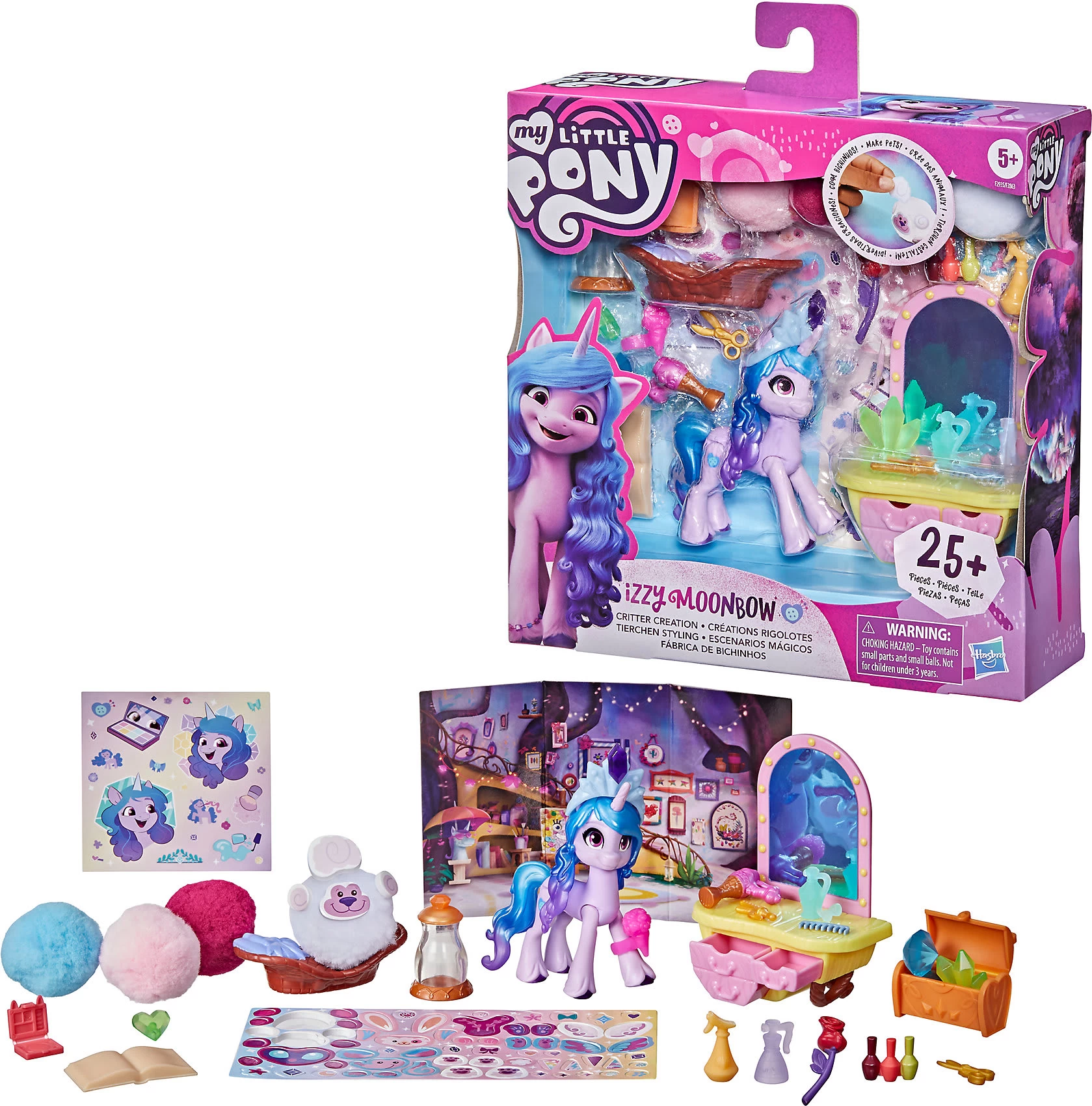 Mit den Storyszenen-Spielsets können Kinder ihre eigenen Geschichten entstehen lassen! Jedes Set enthält eine 7,5 cm große, bewegliche Ponyfigur mit geformten Haaren. (Jeweils separat erhältlich. Je nach Verfügbarkeit.) Die Sets enthalten jeweils über 25 Accessoires, die von den Charakteren inspiriert sind – für jede Menge fantasievolle Spielmomente und zum Anpassen der Figuren. Kinder können beispielsweise kleine Tierchen oder Spiel-Smoothies entstehen lassen. Jedes Set enthält außerdem eine Storyszene als Spielhintergrund, die vom Film My Little Pony: A New Generation inspiriert ist.