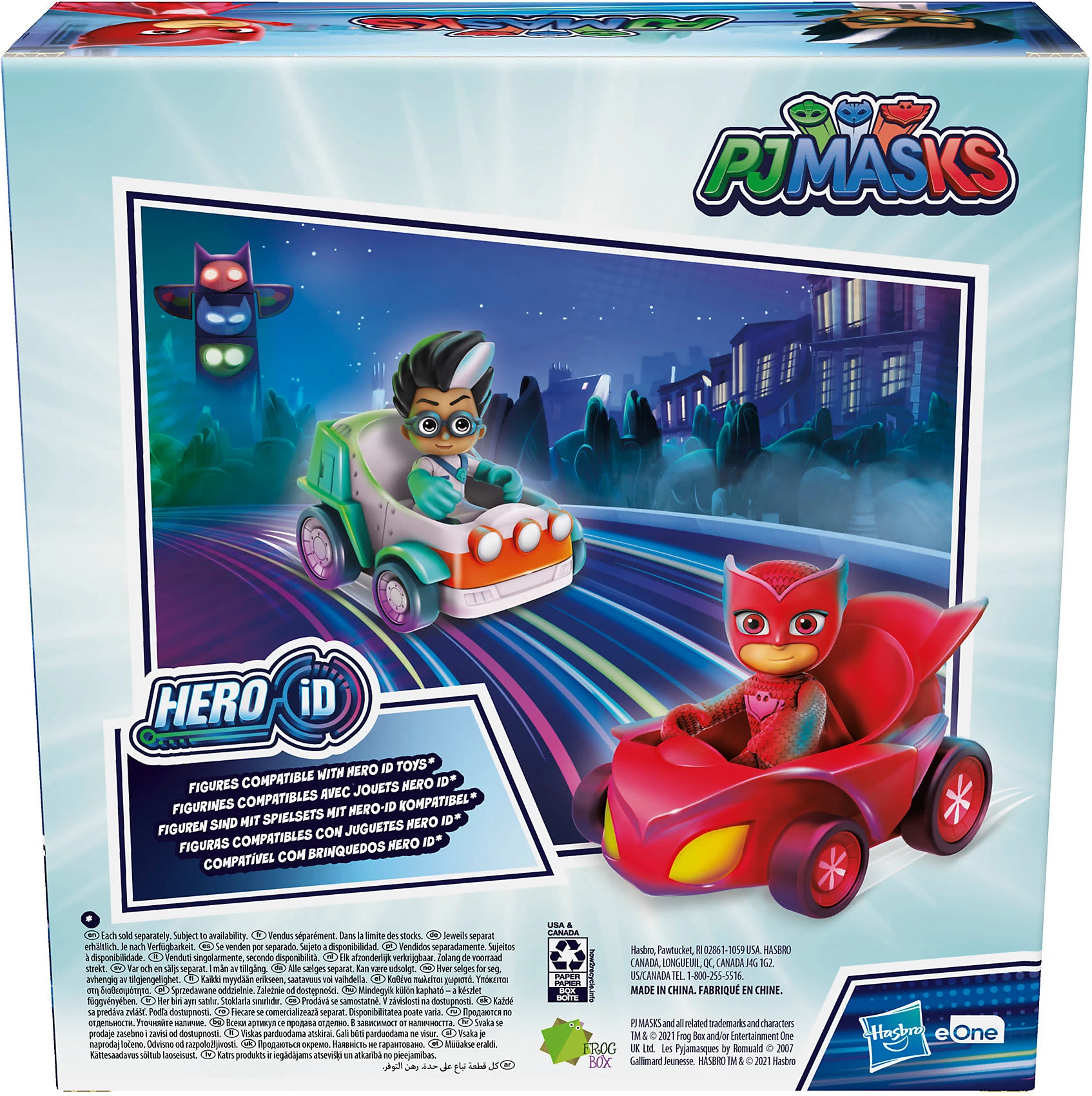 Die PJ Masks Charaktere Owlette und Romeo sind bereit, um mit ihren Fahrzeugen in das nächste Abenteuer zu starten. Die Figuren können in die kleinen Autos gesetzt werden, um die Lieblingsszenen aus der Serie nachzuspielen.