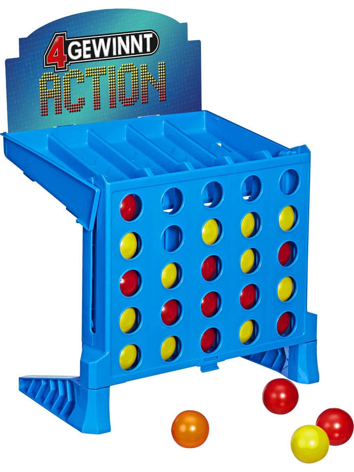 Wer vier in eine Reihe bringt, gewinnt! ‚VIER GEWINNT ACTION‘ ist ein temporeiches Spiel, bei dem es darum geht, die Bälle so schnell wie möglich durch Aufprallen und Springen in eine Reihe zu bringen. Beim Countdown geht’s rund: 1-2-3 Action! Zwei Spieler versuchen gleichzeitig, die leichten Bälle in die Rasterwand zu schleudern. Dabei müssen die Bälle auf dem Tisch aufprallen, bevor sie in die Rasterwand springen. Der Spaß geht weiter, bis ein Spieler 4 Bälle seiner Farbe in eine Reihe bringt und gewinnt. Ist das Spiel vorbei, kann die Rasterwand zu einer handlichen Aufbewahrungsbox zusammengeklappt werden.