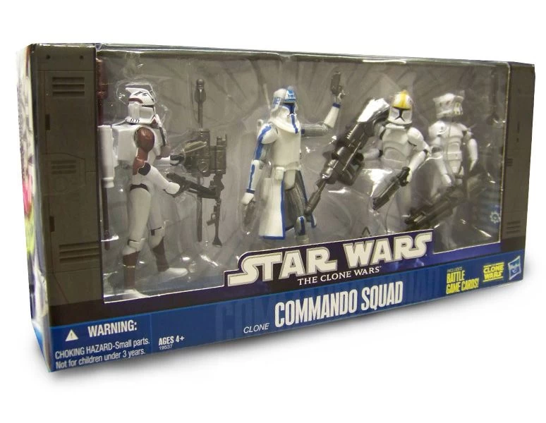 4er Figuren Set mit einem Commando Squad aus Star Wars – Clone Wars. Enthalten sind: Captain Rex, Clone Trooper (space gear), ARF Trooper und Clone Pilot. Inklusive Battle Game Cards, Verpackung: Windowbox.